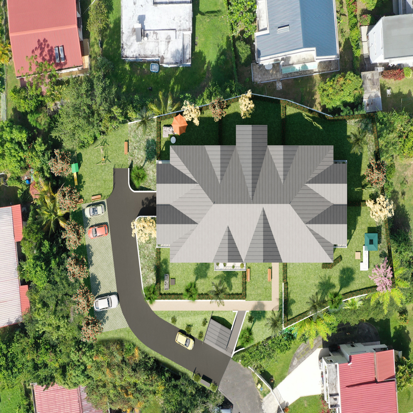 Dans le quartier de Cluny, entre Schoelcher et Fort-de-France, splendide petite résidence de 15 appartements (T3, T4 et 2 T1) au bout d'une impasse, dans un quartier extrêmement calme.