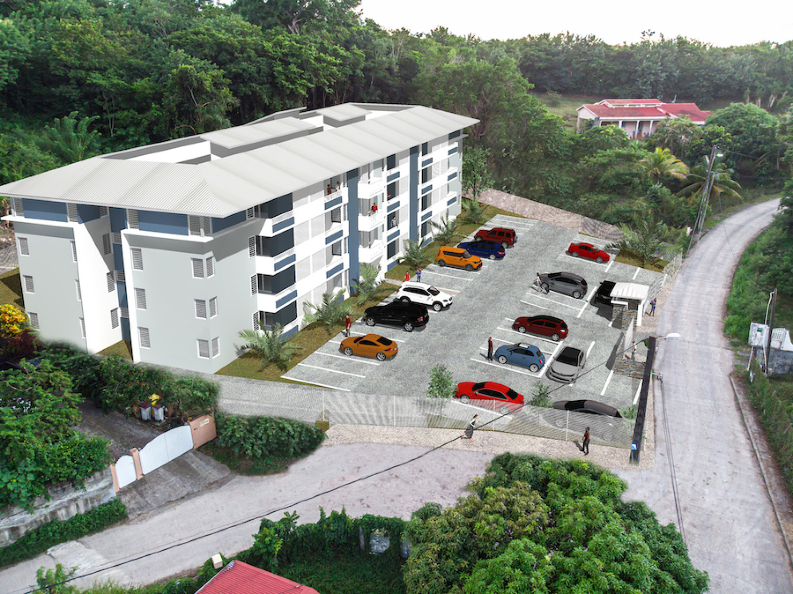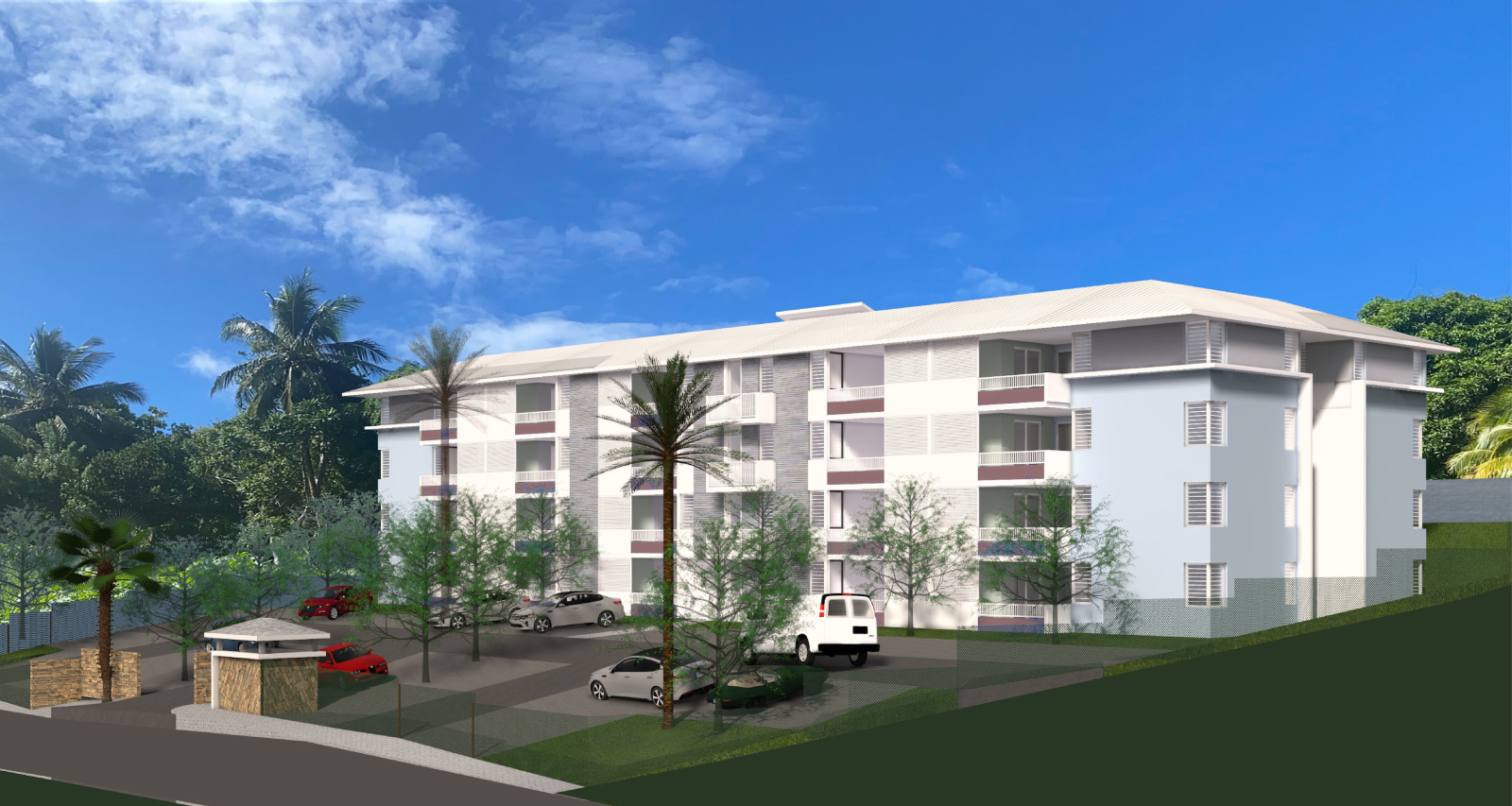 Sur la commune du Diamant, quartier La Cherry, résidence sur 3 niveaux proposant des appartements T1, T2 et T3 bien équipés (climatisation dans les chambres, cuisine et salle d'eau aménagée).