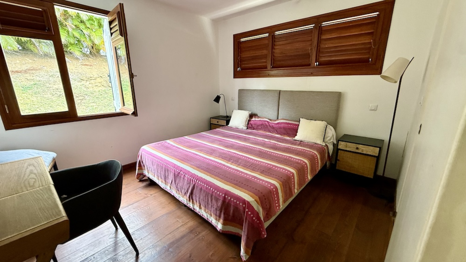 à l'étage, 2 très grandes chambres climatisées avec accès terrasse, chacune leur salle d'eau et WC, grande buanderie