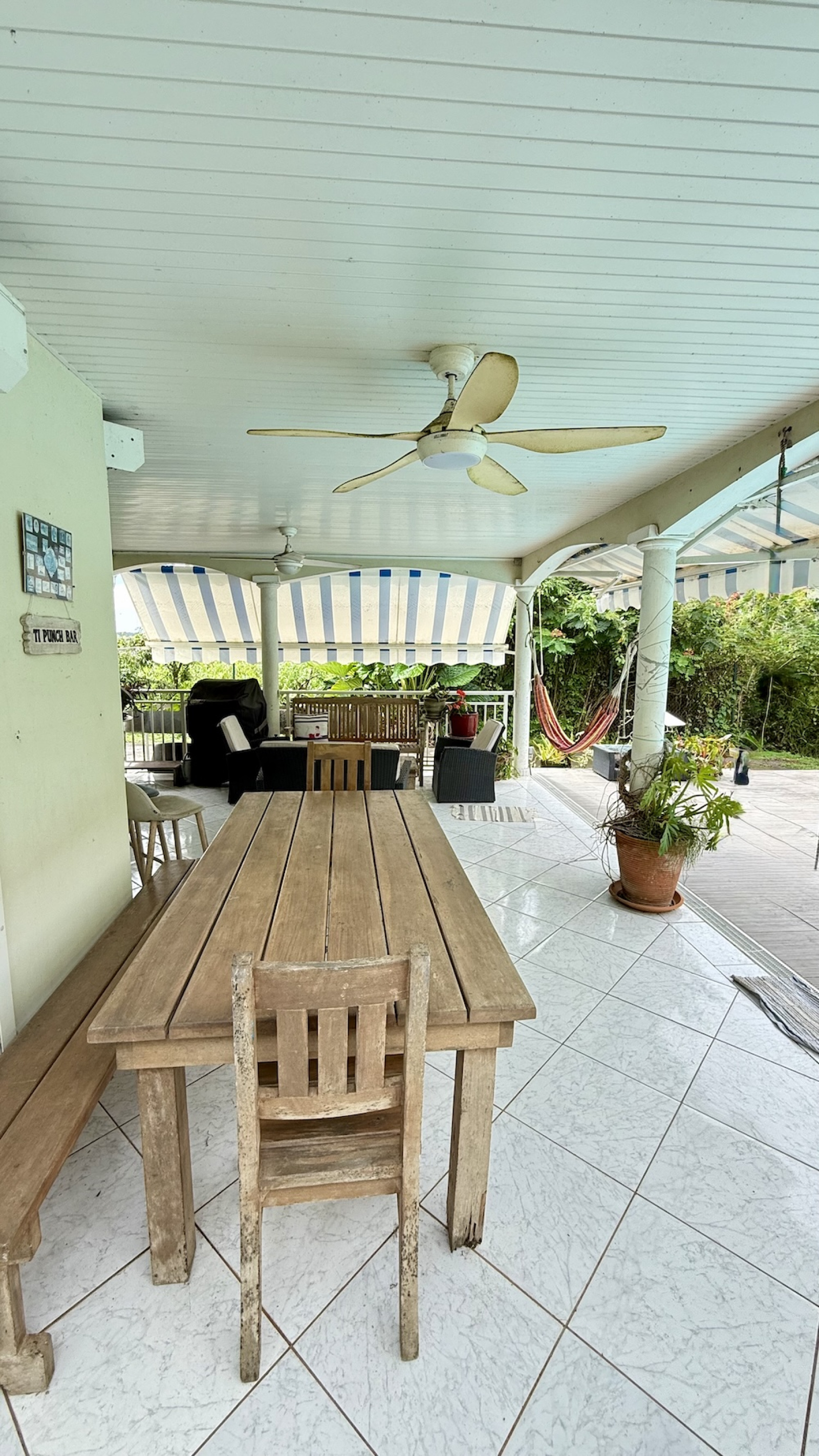 Étage : chambre parentale climatisée avec salle d’eau double vasque et wc, dressing, deux autres chambres climatisées avec placards aménagés, salle d’eau double vasque avec wc.